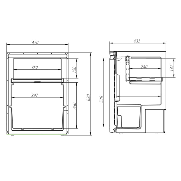 - Størrelse: Bredde: 470 mm, Dybde: 431 mm, Højde: 630 mm