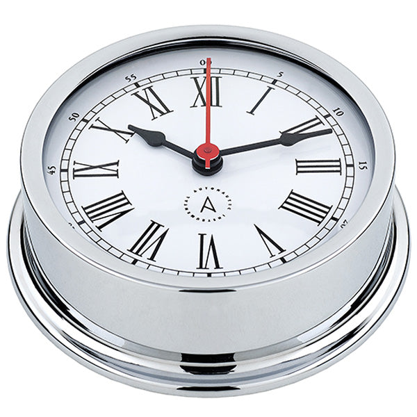 Med en base på 120 mm og en hvid skive med romertal giver uret et tidløst udtryk, mens det robuste kabinet i forkromet messing sikrer lang holdbarhed og modstandsdygtighed mod det maritime miljø. Uret er udstyret med et Quartz-værk med en frekvens på 32.786 KHz, hvilket garanterer præcis tidtagning under alle forhold.