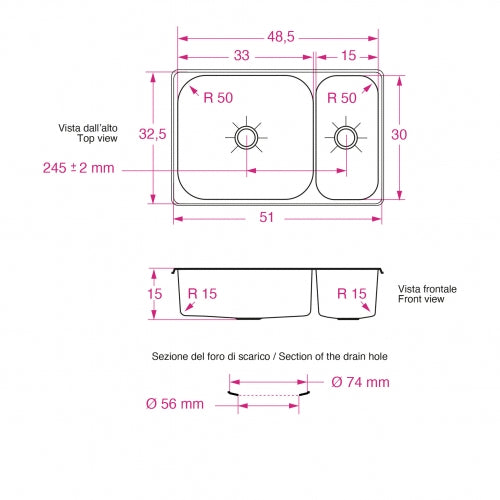 Barka, Dobbelt vask RF 32,5 x 51 cm, Rustfrit stål, 330x300 mm (stor), 150x300 mm (lille)