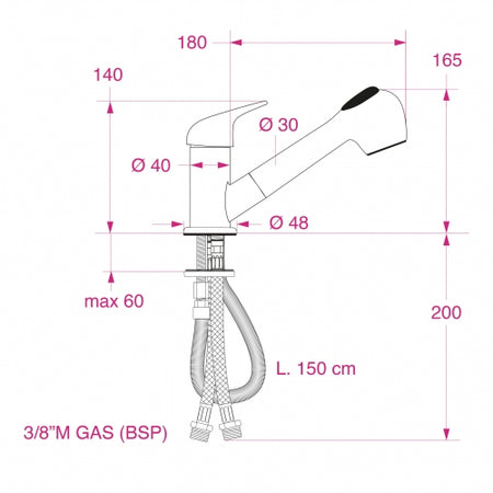 - Bruser: Justerbar stråle med 1,5 mtr. udtræksslange