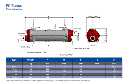 Oliekøler FC80 1" olie, vand 58mm, 13,0 kW, 272mm, Ø 113mm