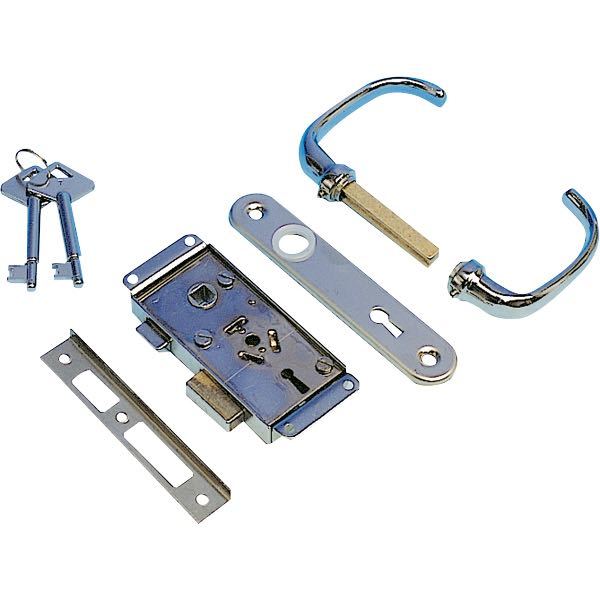 Dørlås - påbygning 46 x 113mm højre indadgående, 2 nøgler, dørskilt og vrider