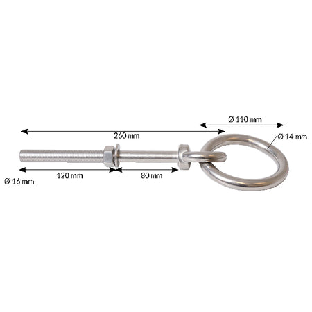 Fortøjningsbolt med ring RF, Ø16mm, 260mm, AISI 316