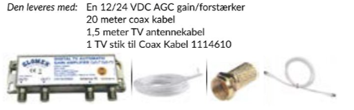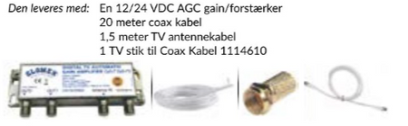 - Inkluderer: 12/24 VDC AGC gain/forstærker, 20 meter coax kabel, 1,5 meter TV antennekabel, 1 TV stik til Coax Kabel 1114610