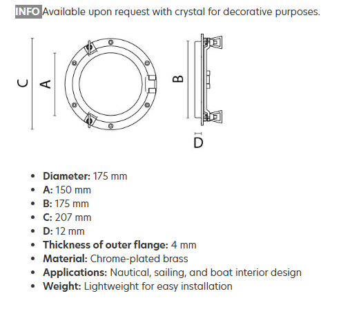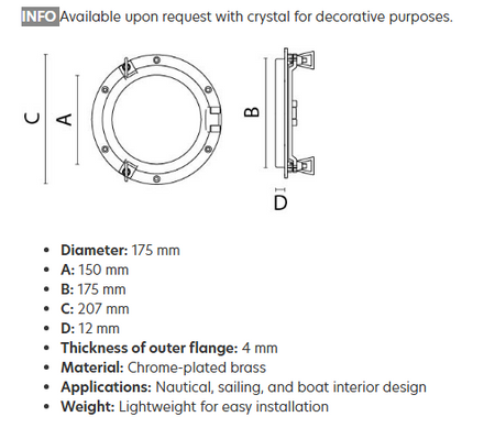 Koøjet er fremstillet af holdbart krom, hvilket sikrer en lang levetid og modstandsdygtighed over for vejrpåvirkninger. Det er den perfekte løsning til at forbedre udsigten og lysindfaldet i din båd, samtidig med at det opretholder en høj standard for æstetik.