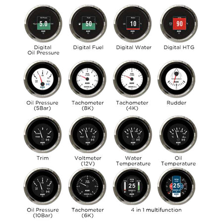 - Multifunktionalitet: Viser spænding, brændstofniveau, vandstand, vandtemperatur, olietemperatur, olietryk, holdetank og trim.