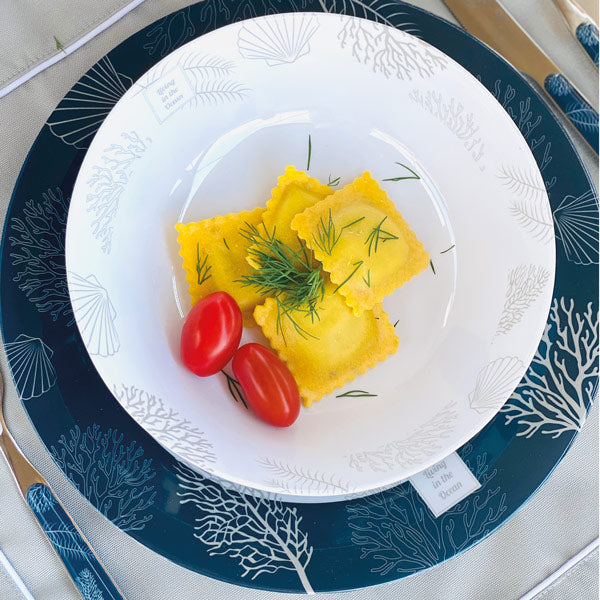 MB Living suppetallerkener fra Marine Business kombinerer funktionalitet og æstetik i et sæt med 6 tallerkener. Med deres elegante koraldesign i marineblå og beige skaber de en moderne stemning ved bordet. Tallerkenerne er fremstillet af 100% melamin, som gør dem lette og praktiske til både hverdagsbrug og særlige lejligheder.