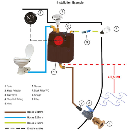 Tankens konstruktion i højdensitets polyethylen sikrer holdbarhed og modstandsdygtighed over for vejrpåvirkninger. Den er designet til at kunne installeres på bådens skot, hvilket sparer værdifuld plads. Takket være tyngdekraftsudledningsteknologien kan tanken tømmes uden pumpe, når den er installeret mere end 0,5 m over vandlinjen.