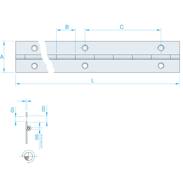 Rustfrit Pianohængsel, 1000x32 mm, 60 mm hulafstand - AISI 304