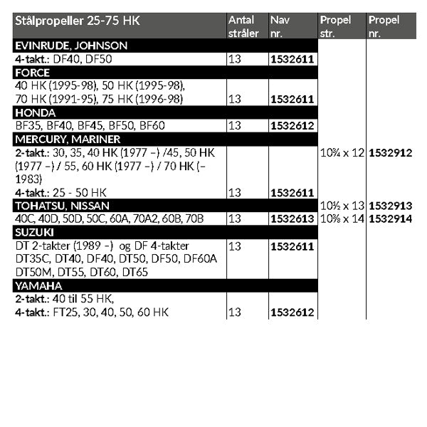 - YAMAHA: 2-takt: 40 til 55 HK; 4-takt: FT25, 30, 40, 50, 60 HK