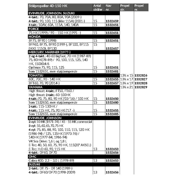 - EVINRUDE, JOHNSON, SUZUKI: 4-takt: 50AV, 60A, 70, 70A, 80, 80A, 90A (2009-), 90, 100, 115 (ikke 115A) (2001-), 140, 140A