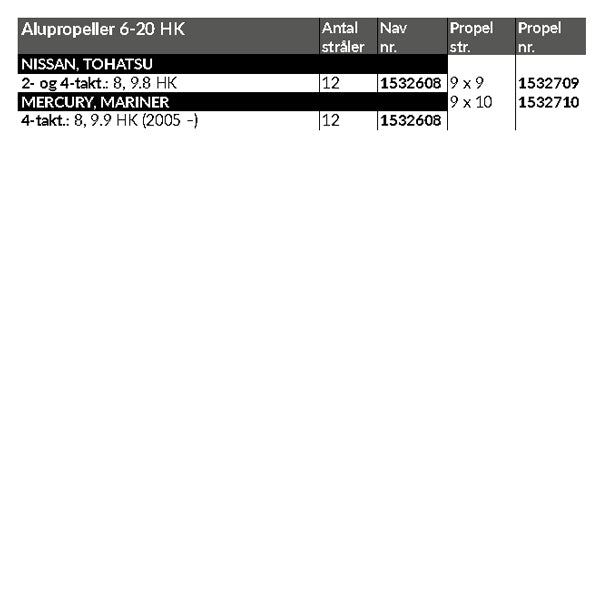 Propellen passer til både Nissan og Tohatsu motorer samt Mercury og Mariner motorer fra 2005 og frem. Med en diameter på 9" og en stigning på 9" er denne propel et fremragende valg til dem, der ønsker at forbedre deres båds ydeevne.