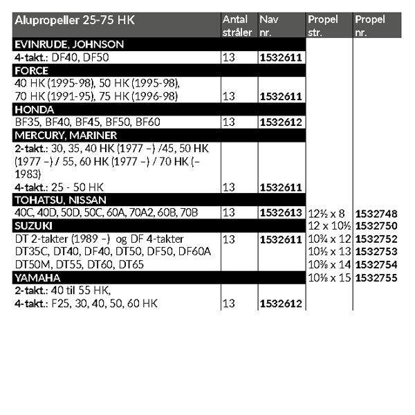 - YAMAHA: 2-takt: 40 til 55 HK; 4-takt: F25, 30, 40, 50, 60 HK