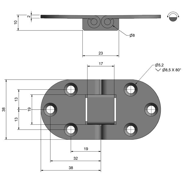 Roca, Bordhængsel 180º, AISI 316, 76 x 38 mm