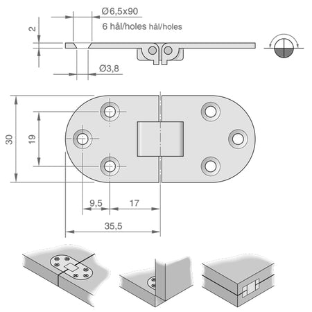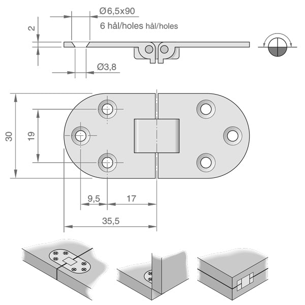 Roca, Bordhængsel 180º, forkromet messing, 71 x 30 mm