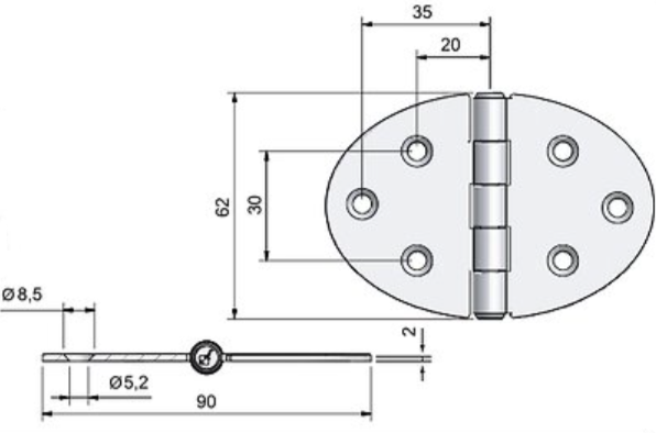 Roca, Hængsel elips RF, AISI 316, 62x90mm