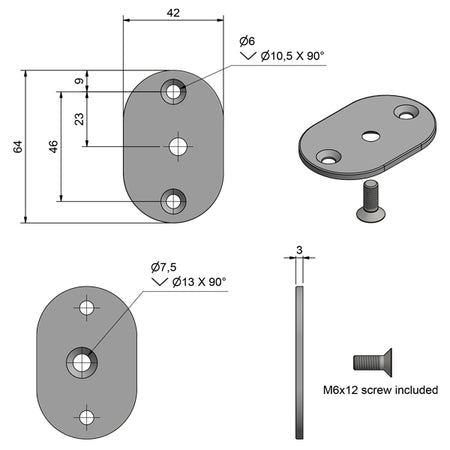 Roca, Oval skive til gribehåndtag inkl. skrue, 46 mm hulafstand, AISI 316, 64x42 mm, 3 mm tykkelse
