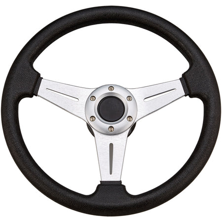 Dette sorte sportsrat med aluminiumselementer kombinerer funktionalitet og æstetik. Med en diameter på 338 mm og et 3/4" standard nav, er det designet til at give dig den bedste køreoplevelse.