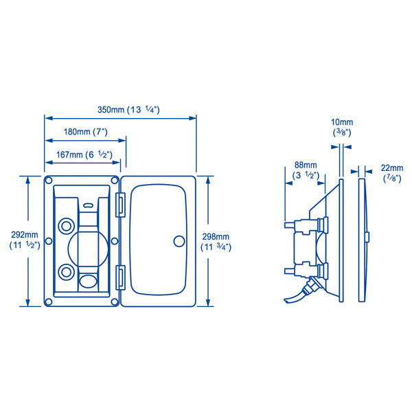 Bruseren kan monteres med eller uden dæksel, og det pænt hængslede dæksel med lås sikrer, at alt forbliver sikkert og i orden. Enkel tilslutning til Whale Quick Connect 15 mm rørføring eller ½" slangeforbindelse gør installationen problemfri.