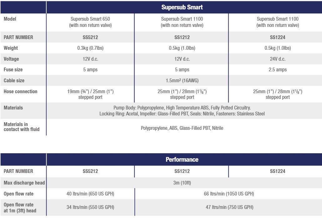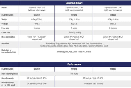 Supersub Smart 650 er kompakt med en vægt på kun 0,3 kg og kan nemt installeres i trange rum. Den bruger 12V strøm og har et moderat strømforbrug på 5 ampere, hvilket gør den energieffektiv sammenlignet med mange andre lænsepumper i samme kapacitetsklasse.